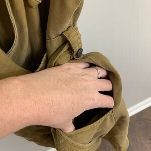 Size S. 100% Tencel. Length 30 1/2 inches. Armpit to armpit 19 inches. Soft. Comfortable. Belted. Olive green to brownish green. Great condition!