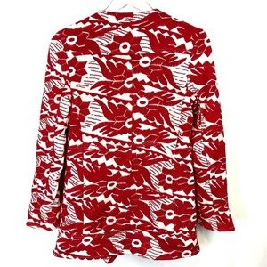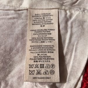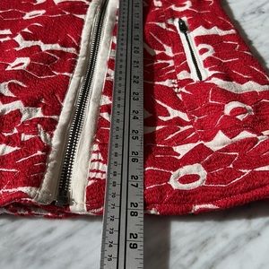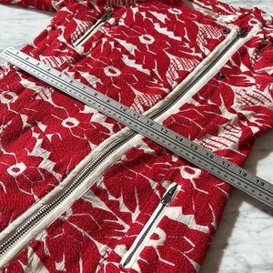 Stylish red and white embroidered devils alley moto coat. Features bold floral pattern. Asymmetrical zipper design. Perfect for a chic look. Well made, heavier material, zipper pockets. Euc! Smoke free home. Very rare! Size 6, can fit an 8 as well. Fits like a true medium.
