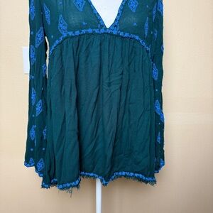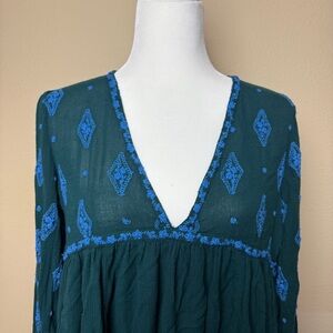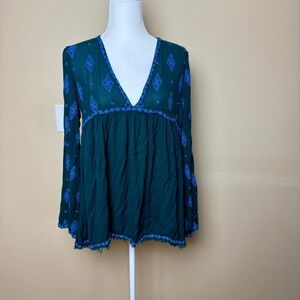 Free People Diamond Embroidered Smock Tunic Top Size Small Bell Sleeve Bohemian