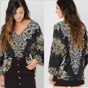 In a flowy oversized silhouette this diamond shaped embroidery tunic features a V-neckline and an open back. Statement bell sleeves and a high low hem. Comfortable and soft rayon fabric. Measurements for size Small Bust: 36" Length: 31" Sleeve Length: 25" Length: 33"