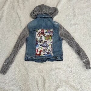 Free People Disney Patches Denim Hooded Jacket XS Jean Knit Sleeve Unique