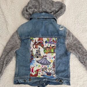 Keywords: Free People, Denim Jacket, Hooded Jacket, Disney Patches, Knit Sleeves, Distressed Denim, Jean Jacket, XS, Extra Small, Unique Jacket, Festival Fashion, Theme Park Outfit, Women's Jacket