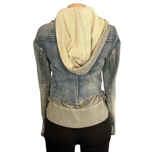 Free People Distress Denim Hooded Sweater Jacket. In size XS. Button up closure with intentional distressing.