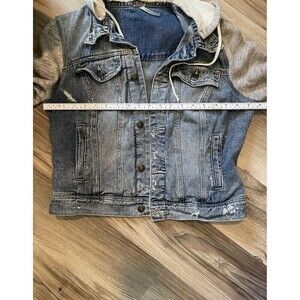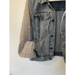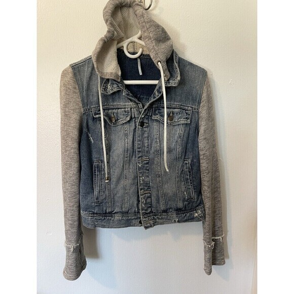 Free People Distressed Blue Denim Jacket Detachable Hood Sleeves Knit Grey Sz M