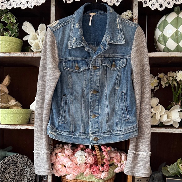 Free People Distressed Blue Denim Jacket with Gray Sleeves