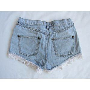 Free People Distressed Boho Cutoff Denim Shorts Lace Trim High Waist Sz 26. Condition is "Pre-owned".