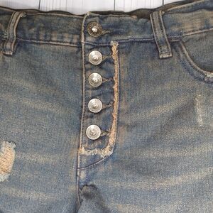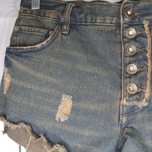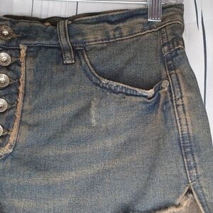 Free People Distressed Dark Wash Denim Shorts with frayed edges