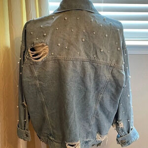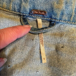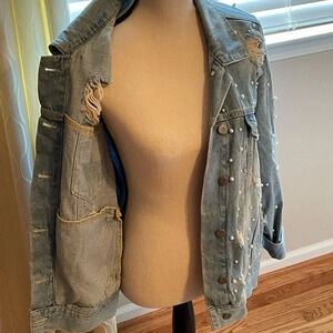 Free People Distressed Denim Jacket Pearls Size Small Oversized Silver Button Front