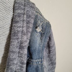 Stay stylish and comfortable with this denim and gray hooded jacket. Perfect for casual outings. Tags: #streetwear #grunge #distressed #skater #emo