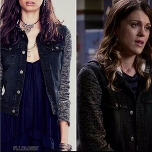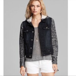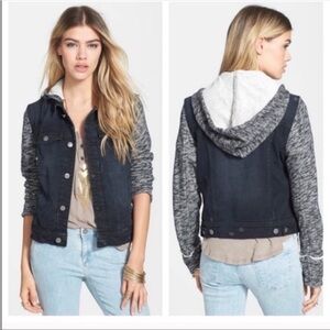 Free People Distressed Denim Jacket With Knit Sleeves Removable Hoodie large
