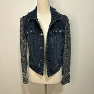 Distressed denim jacket with attached knit sleeves and hood. Button front closure and two front pockets. All over roughed look. A cool piece to add a tomboy edge to any look!