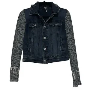 Free People Distressed Denim Jean Knit Sweatshirt Hoodie Jacket size XS