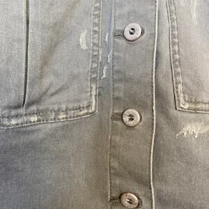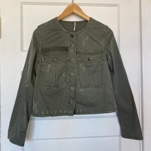 Free People Distressed Denim Patch Jacket Army Green Button Up Pockets Cropped