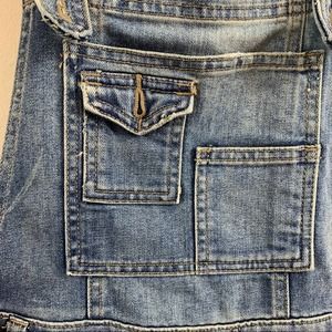Size 24. 71% Cotton 28% Polyester 1% Spandex. Inseam 26 1/2 inches. Waist measured flat 15 inches. Rise 7 1/4 inches. Length shoulder to hem 54 1/2 inches. Two button to adjust length. Lightweight denim. Side zipper. Great condition! Stock picture to fit but the fade varies from my version.