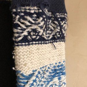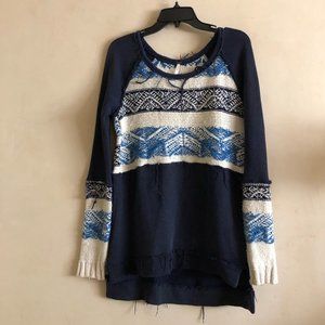 Free People fair isle cotton sweater with intentionally distressed look. Worn several times, but still has some life left. It has piling on the white/light blue portions of the sweater. Dark blue areas don't have it. It blends with the pattern and the distressed look of the sweater. Priced accordingly. Size is XS, but it is easily fits small. Sweater is laundered and ready to be enjoyed.