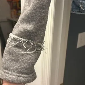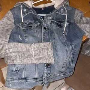 Free People Distressed Jean Jacket w/ sweatshirt sleeves and hoodie- Large EUC