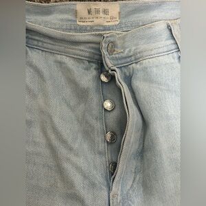 Casual boyfriend jeans with ripped knees. Light blue denim. Small stains on front