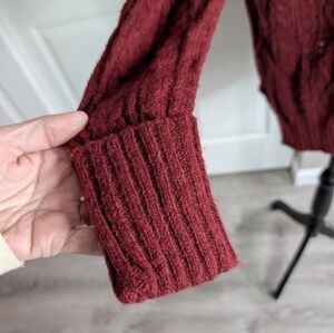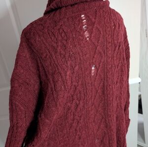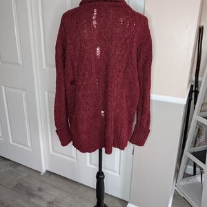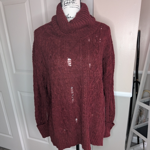 Chic maroon cowl neck sweater. Soft knit fabric. Ideal for layering. Distressed.