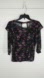 Sheer top featuring a floral print with femme ruffle accents, back keyhole cutout, quarter-length sleeves.