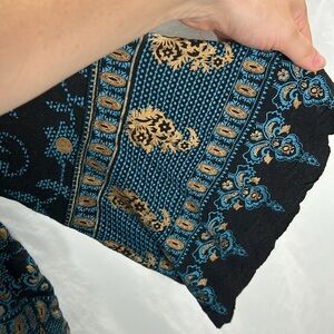 Black v-neck top with blue and gold medallion print. Burnout style fabric. Dolman bell sleeves. Oversized loose fit. Slight cracking in some places to design. Raw hem/sleeve cuffs. Lyocell/linen blend material. Size X-small. Non smoking home.