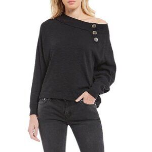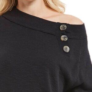 Three buttons detail the asymmetrical placket of this casual-chic top in a soft, textured knit with raw-edge seams.
