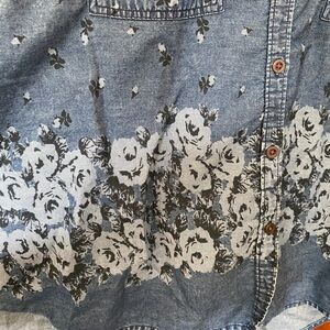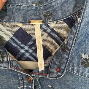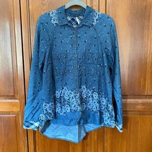 EUC Dottie Over You button front chambray shirt from Free People in a size Medium. This shirt has a floral pattern on the front and back with a plaid inset detail on the back. Slightly longer length in the back. No stains or flaws!