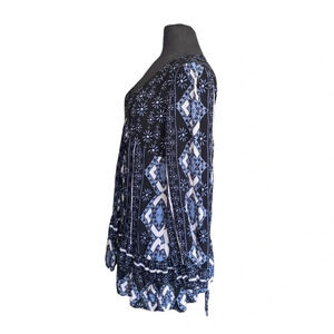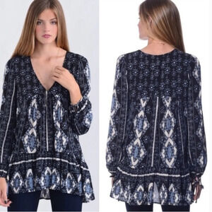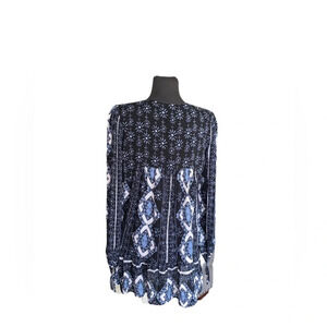 Dark Blue 100% Rayon Relaxed Fit V Neck Boho Eclectic Vibes Long Sleeve Mixed Pattern Tunic Top