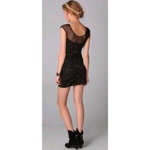 Meet the dragonfly dress - a tight fitting bodycon dress from Free People with allover metallic floral stitching. It's got a matching mesh neckline and sleeves with allover tonal Swiss dot design, and gold embroidered floral detailing!