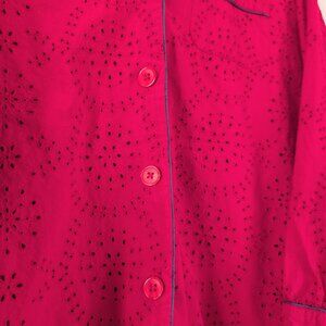 This red eyelet top features contrast piping with a button front and a single bust pocket. Red with starburst embroidered eyelet design. Lightweight.