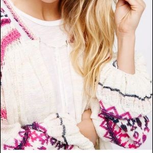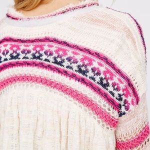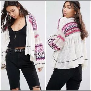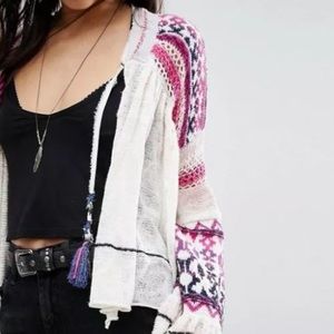 Cropped to the natural waist this knit cardi is featured in an oversized silhouette with an open front and fun pattern. Wide sleeves with elastic cuffs and unfinished trim