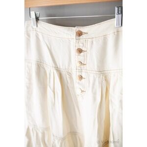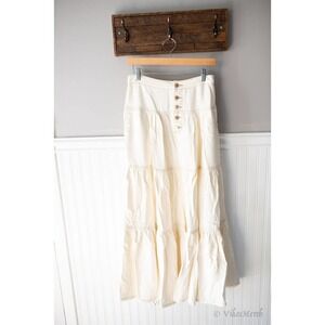 Your favorite denim skirt gets an upgrade with this must-have tiered style, featured in a billowy maxi silhouette and dropped waist design with exposed button closures for a retro-inspired touch.