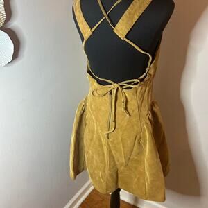 Features: Vegan suede fabrication, deep V-neckline, defined seams throughout, gathered hip detail for added dimension, open-back with strappy detailing, self-tying closure, zipper at back