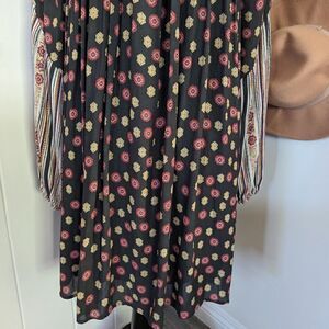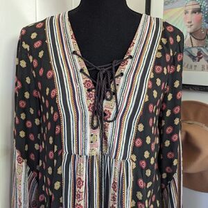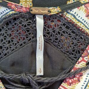 Description: Free People Rain or Shine Tie Front Printed Dress sz SM EUC, go for a boho look with this lace-up dress, plunging v-neckline with lace up detail, pull over styling, ties at the chest, long peasant sleeves with cinched cuffs. Two top side slip pockets, crochet trim at shoulders and back, lined