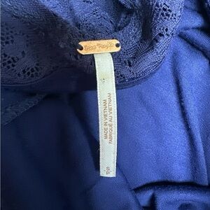 Excellent preowned condition beautiful blue lace look overlay dress in size small. Asymmetrical design.