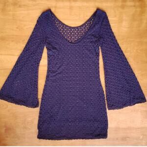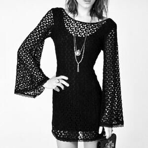 Free People Dress Medium Navy Crochet Lace Lined Boho Whimsigoth Bell Sleeve