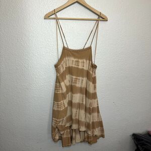 This Free People mini dress is perfect for the beach or a casual outing. The square neckline and strappy sleeves, along with the tie closure, give it a bohemian look. The dress is made of 100% cotton and is machine washable for easy care. The tie-dye pattern adds a touch of hippie style to this summer and spring dress. The beige color and seashell sand dune theme complete the beachy vibe. New with tags. Style tags- beach, hippie, boho, vacation