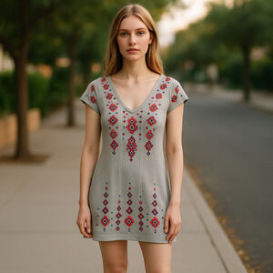Decorative embroidered geometric motifs and embellishment on front, sleeves, and hem