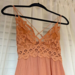The Free People Intimately Adella Babydoll Mini Dress in XS is a stylish and romantic piece perfect for various occasions such as travel, parties, or casual outings. With a sweetheart neckline, sleeveless design, and delicate lace fabric, this boho fairy dress exudes a whimsical and ethereal charm. The smocked detailing and ruffle accents add a touch of bohemian flair, while the pink color and dusty character make it a lovely choice for the summer, fall, or spring seasons. Ideal for those who love slip dresses and want to make a statement with their outfit.