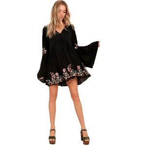 Free People Dress XS Mini Long Flare Sleeve Embroidered Boho Floral Black