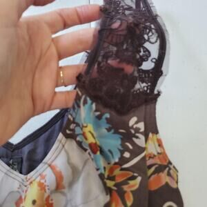 Color: Brown with multicolor floral (white, orange, blue) and black lace/tulle accents