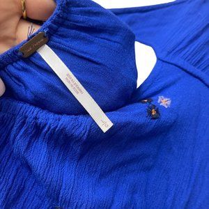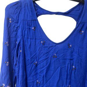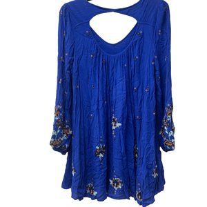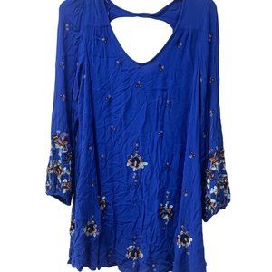 Beautiful Blue Free People Dress with floral embroidery detail. Size L. Dress is flowy and fits so comfortably. I barely wore this dress, there are minor pulls in some of the embroidery but barely noticeable and still in good condition!