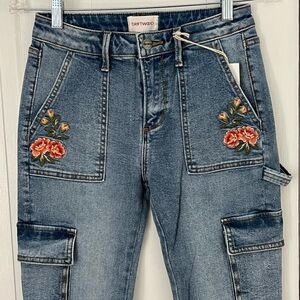 Features: Zip fly and button closure, oversized cargo pockets throughout, floral embroidered appliques throughout, hammer loop feature