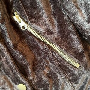 Super cool soft velvet jacket from We The Free collection featuring a double button placket at front with side zip pockets and button-closure collar in a cropped fitted silhouette.