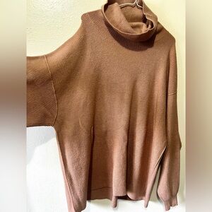 Cute and cozy Free People branded Softly Structured Tunic style sweater in a pretty dusty rose/soft pink color, oversized fit, turtleneck/cowl neck line, medium/heavy weight knit construction, ribbed cuffs, dropped shoulders, longer length.