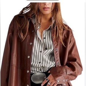 This stunning Free People jacket in size Medium is the perfect addition to your wardrobe. The jacket features a long length and snap closure, making it both stylish and functional. The vegan leather material gives it a unique look while the brown color adds a touch of sophistication. The Easy Rider model is perfect for any woman looking for a versatile and trendy jacket.