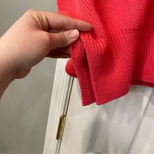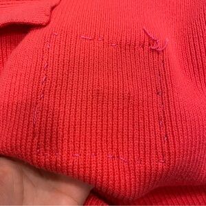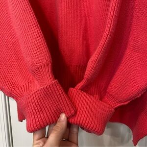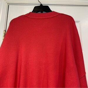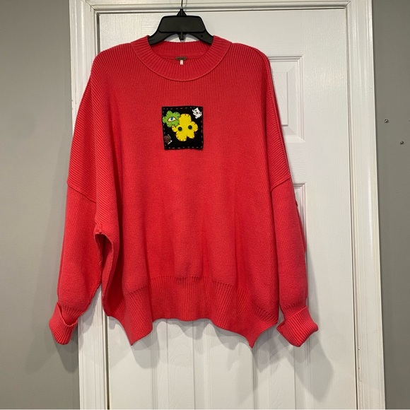 Size XS. A shade of pink in color. Amazing oversized knit sweater. Ribbed mock neck pullover. Tunic length. Slouchy silhouette. Side slits. Exposed seams on outside. Sleeve cuffs can fold up. Handmade patch stitched on the front- easily removable if wanted. Last picture shows the back of the patch stitching. Features a black patch with flowers, evil eye, & cat buttons. Boho free people.