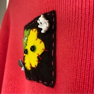 Cozy red sweater featuring a charming floral patch. Perfect for adding a pop of color to your wardrobe.
