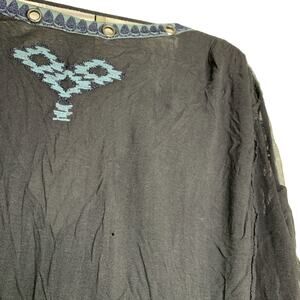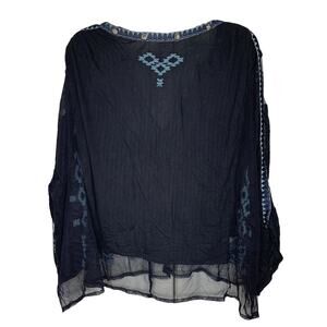 Free People Eden Mesh Bohemian Detail Oversized Tunic Blouse Top Aztec Tribal Embroidery Boho Black Teal Embellished V Neckline Fairy