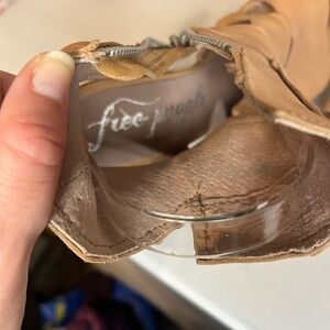 Intentionally distressed supple cutout leather bootie with a stacked heel. Can be dressed up or down. Minor scuffing on the leather by the toes, may clean off.