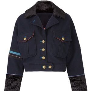 Free People Wool Blend Eisenhower Military black jacket fully lined with bold red lining. Features Blue Stitching and Gold Button details. Red lined Breast Pockets with flaps and gold button closure. Ribbon & Bead detailing at sleeves with Faux fur collar & cuffs.